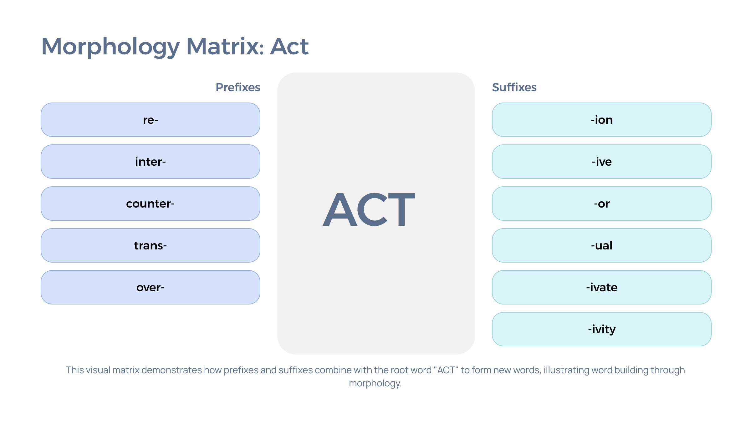 Imagine this: A single, simple root word like act—meaning "to do" or "to perform"—sits at the heart of dozens of everyday and academic words your students encounter. One root, combined with prefixes and suffixes, explodes into an enormous family of related words, transforming a basic idea into precise, powerful vocabulary.