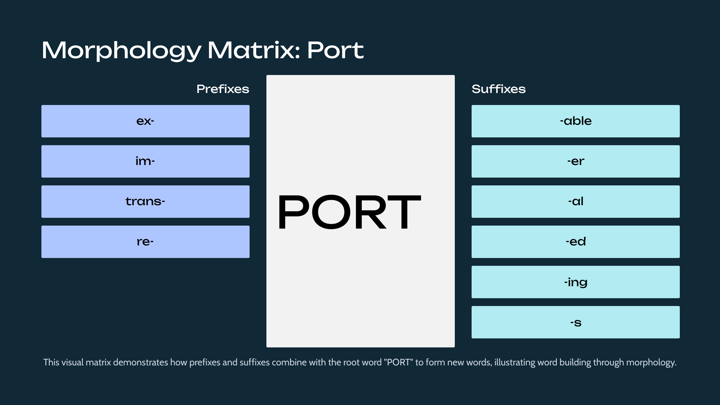 Suddenly, a child who knows act or port can decode and infer meanings for unfamiliar words in reading, spell them more accurately, and use sophisticated vocabulary in writing. Instead of memorizing isolated lists, they see the system: suffixes like -ion turn verbs into nouns (action), -ive makes adjectives (active), -or creates agents/doers (actor), -ist forms specialists (activist), and -able indicates capability (actionable).